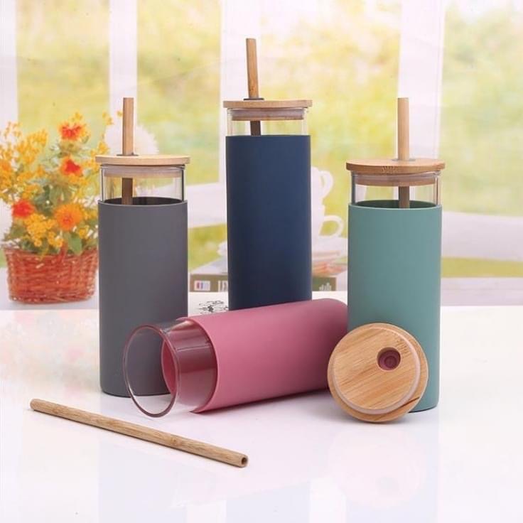 550ml Coffee Glass Bottle with Wooden Lid & Straw