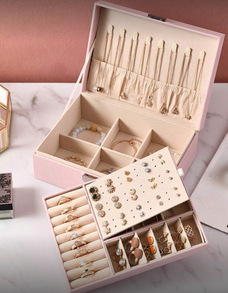 Organize your jewellery collection in style with our Large Capacity Double Layer Leather Jewellery Organizer. Featuring a lock system, this organizer ensures the safety of your valuable pieces. With its spacious design, it can hold all your accessories efficiently, making it a must-have for any jewellery lover.
